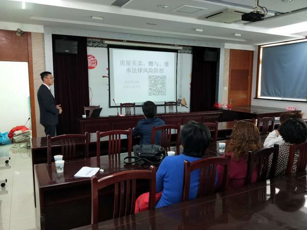 2018年3月29日下午1:30,郑律师受邀为市千灯镇秦峰社区作房屋买卖、赠与、继承法律风险防控的讲座。按照市民现在的投资和资产现状,大部分资产都在房屋上,有的是拆迁补偿安置的,有的是挣钱购买的,银行的存在基本都很少,有了一部分存款就想着付个首付贷个款买个房子,大家碰面闲聊主要话题除了子女教育,就是有几套房子,涨了多少钱,市场价值多少。所以对房子的风险把控,就是对大多数财产的风险把控,意义重大。而房子的法律风险主要体现在交易转换环节,主要就是买卖、赠与和继承。